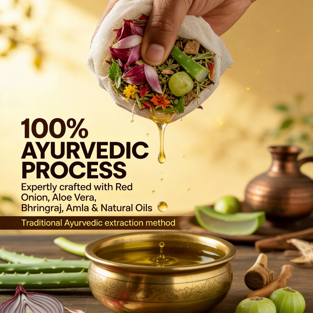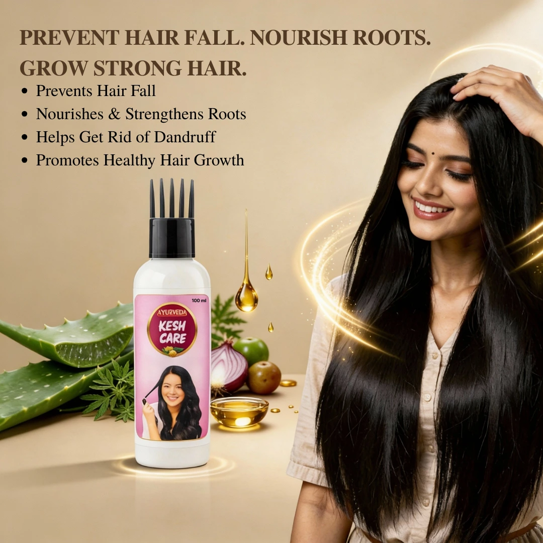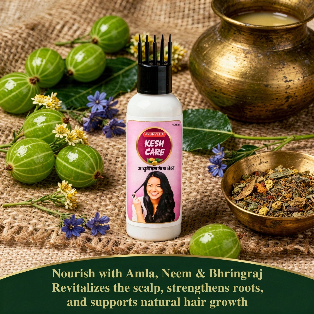 Kesh Care Ayurvedic Hair Oil is a powerful blend of traditional herbs and natural oils crafted to nourish the scalp, reduce hair fall, and promote thicker, healthier hair growth. Enriched with bhringraj, amla, brahmi, neem, hibiscus, and cold-pressed coconut and castor oils, it strengthens the roots, improves blood circulation, and helps prevent premature greying. Its lightweight yet deeply penetrating formula soothes dryness, controls dandruff, and restores natural shine without making the hair sticky. With regular use, Kesh Care Ayurvedic Hair Oil revitalizes dull, damaged hair and leaves it soft, silky, and naturally strong from root to tip.